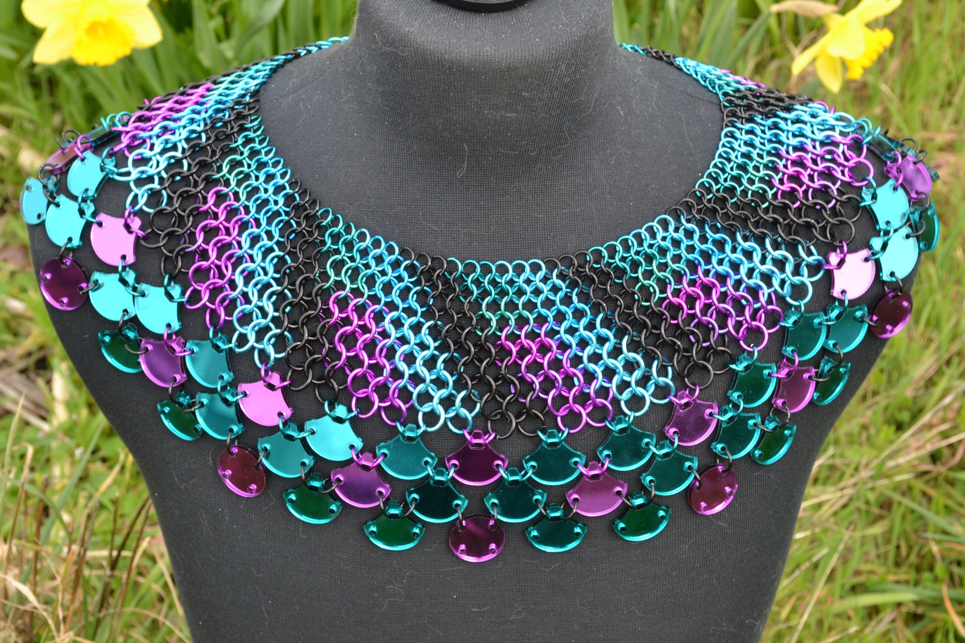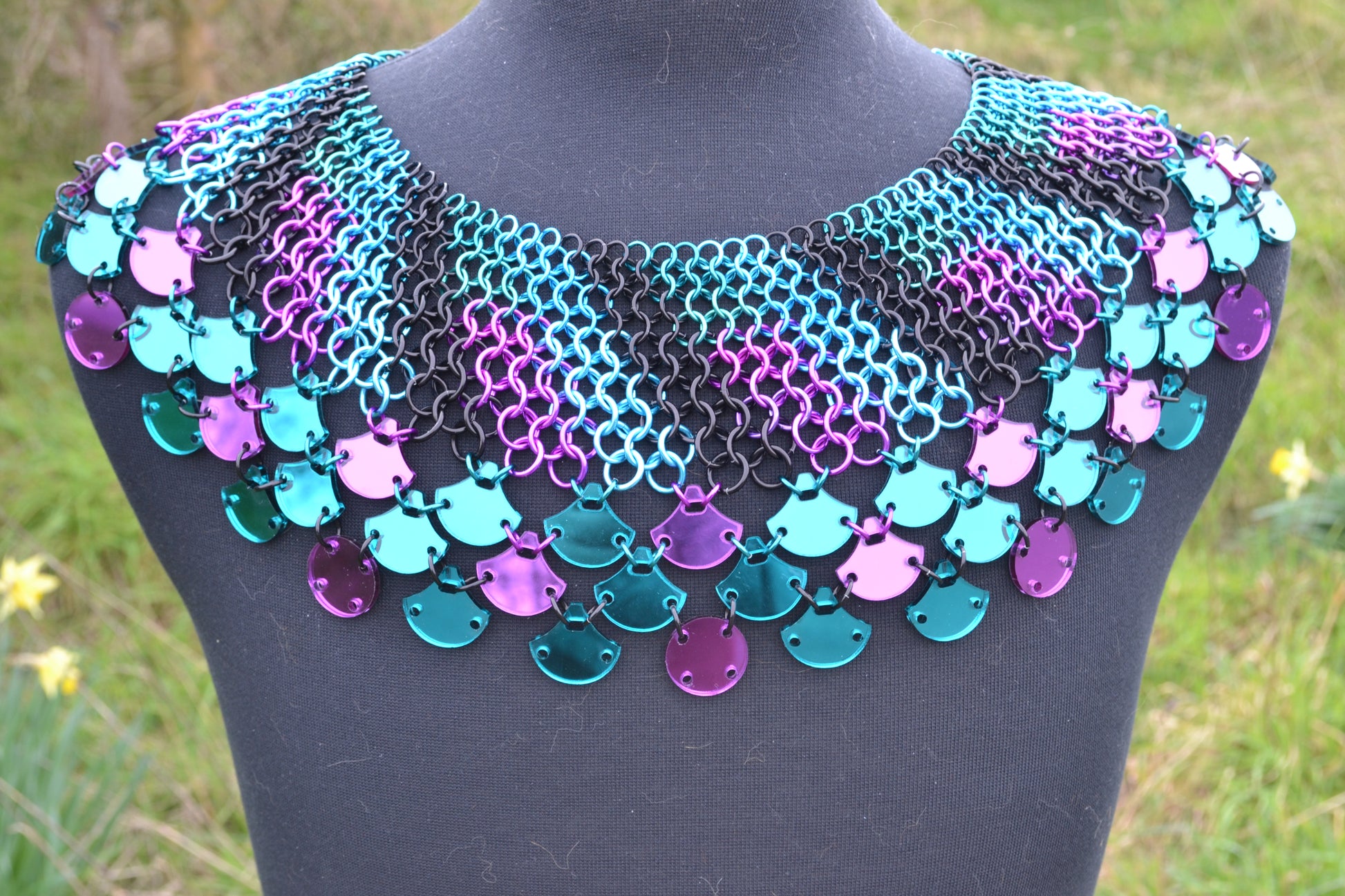 This collar was created with anodized aluminium links and mirrored plexi-glass. Based on the collars of various cultures, and the vibrant colours of the African violet, this unique piece adds both elegance and flair to any outfit.